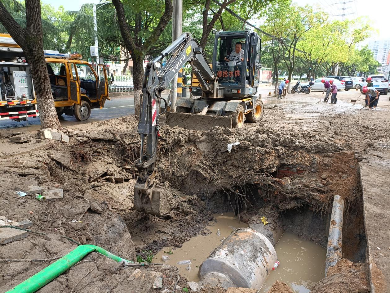 在搶修現(xiàn)場(chǎng)看到,公司副經(jīng)理曾國剛、運(yùn)維部部長(zhǎng)劉要華正在組織工作人員設(shè)置路障,指揮挖掘機(jī)開挖路面、清理淤泥。2輛搶修車停在路邊,保障后勤需要,10余名工作人員正在分工明確地投入到緊張的搶修中。