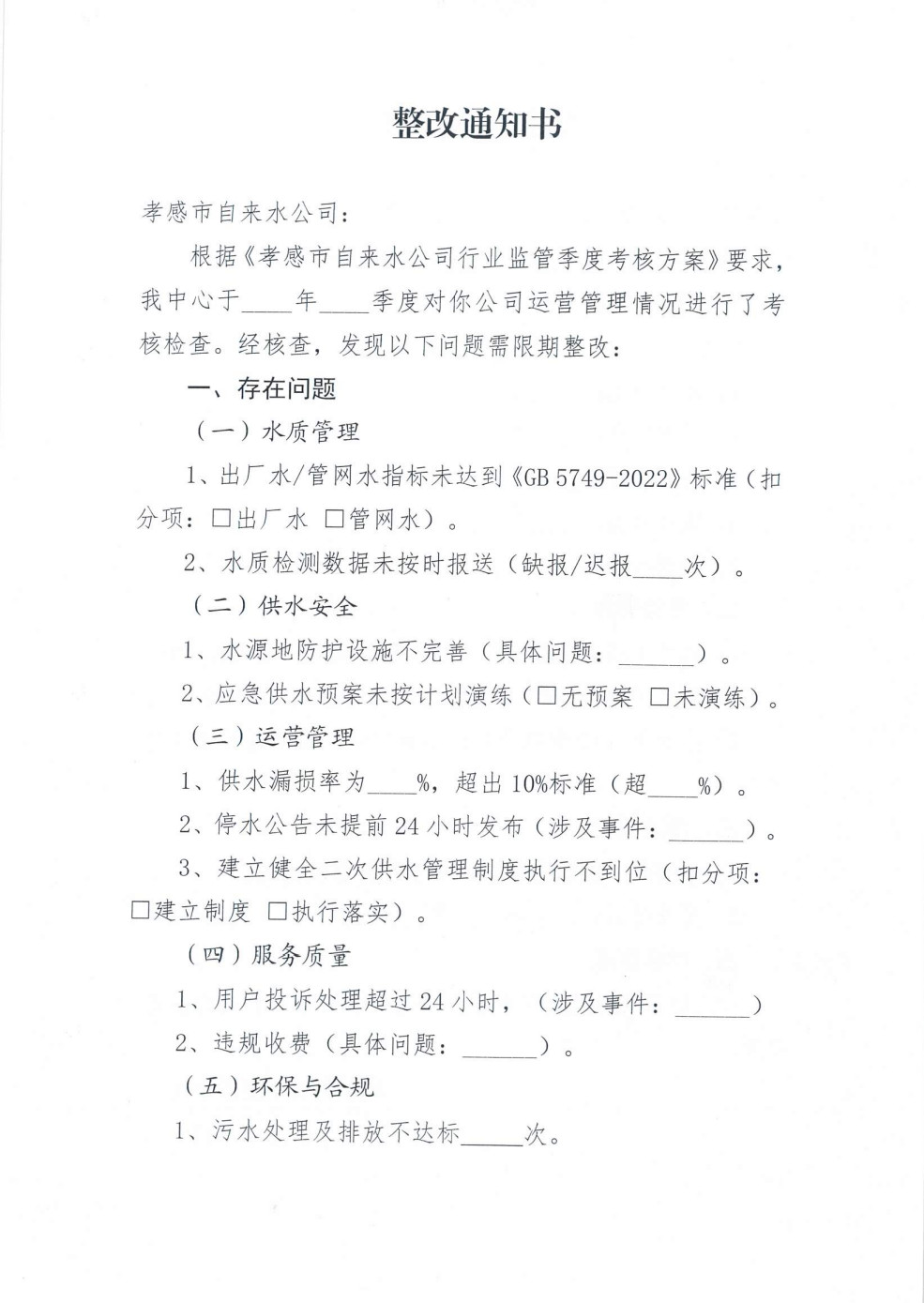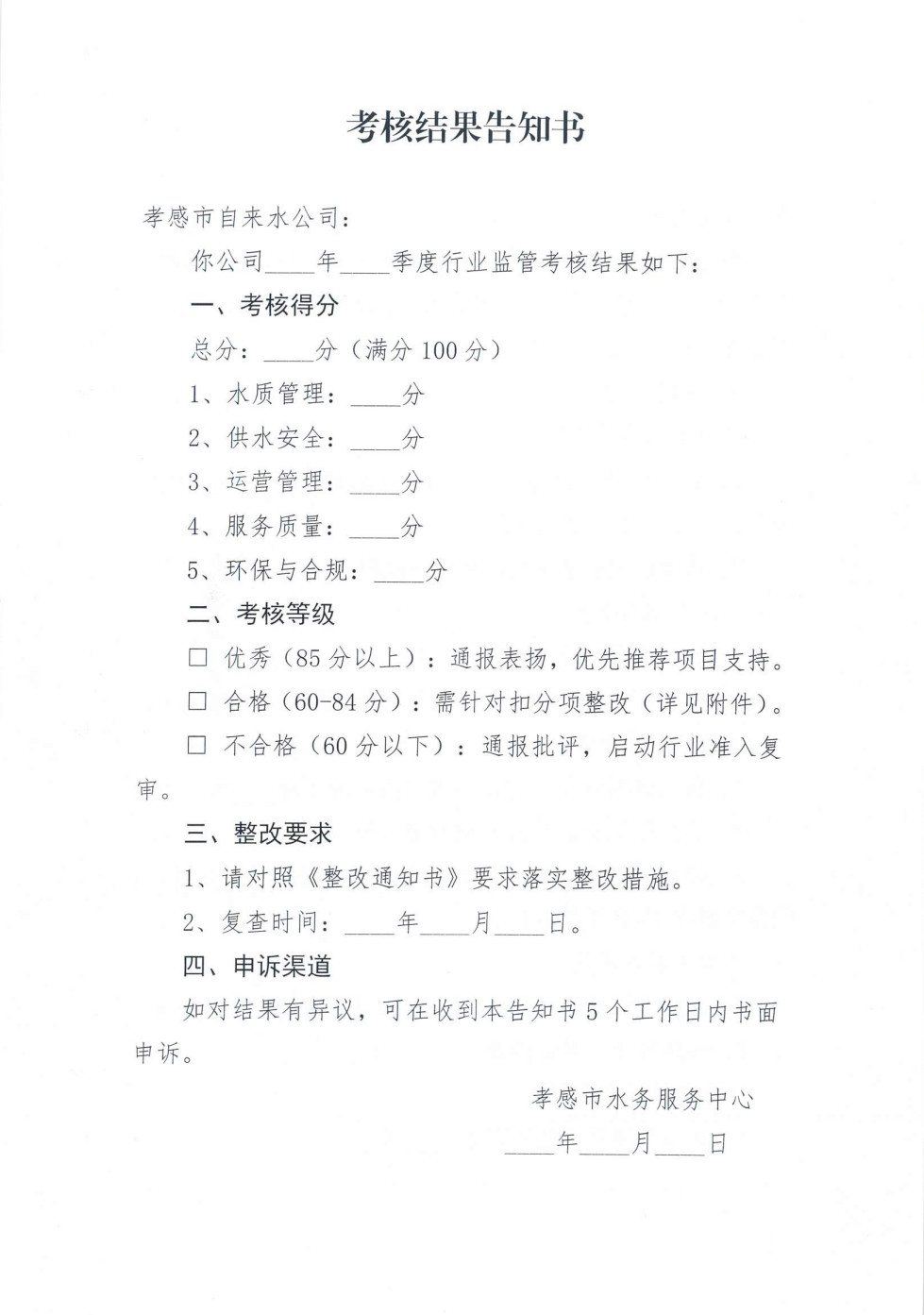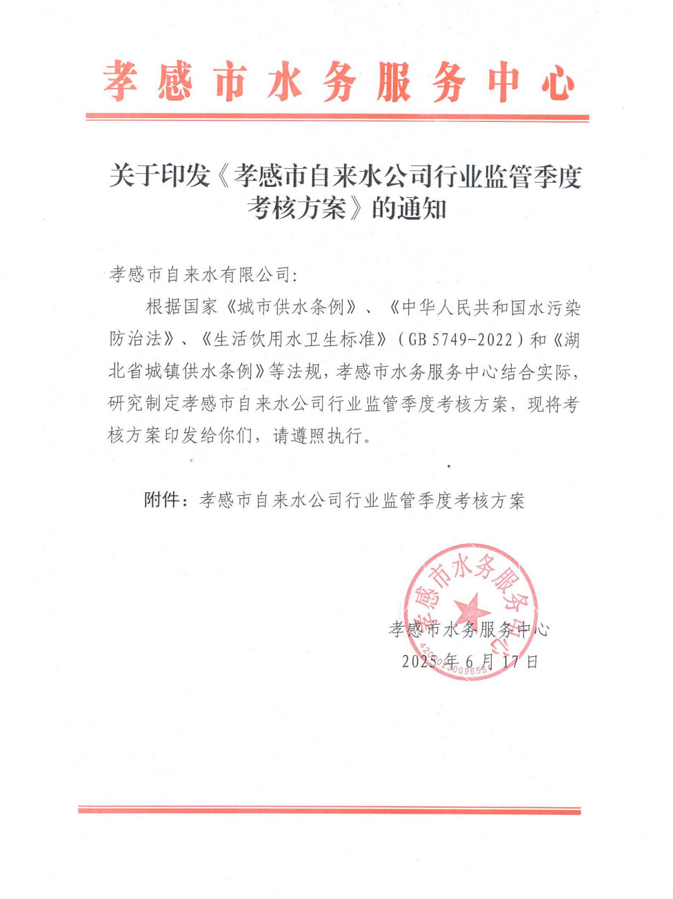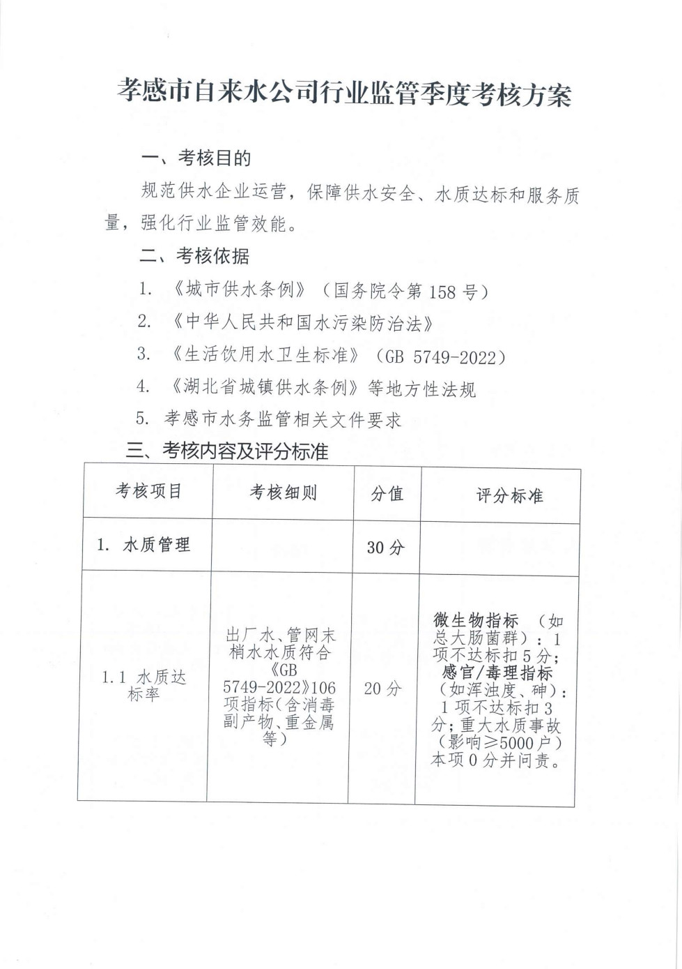 關(guān)于印發(fā)《孝感市自來水公司行業(yè)監(jiān)管季度考核方案》的通知