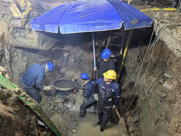 為將停水影響降至最低,運(yùn)維部經(jīng)周密研判,果斷決定將施工窗口期設(shè)定在深夜。技術(shù)人員連夜開挖探查,根據(jù)管道破損實(shí)際情況精準(zhǔn)制定多套維修方案,最終克服技術(shù)難題,選定高難度的帶水作業(yè)方案,最大限度縮短停水時(shí)長(zhǎng)。