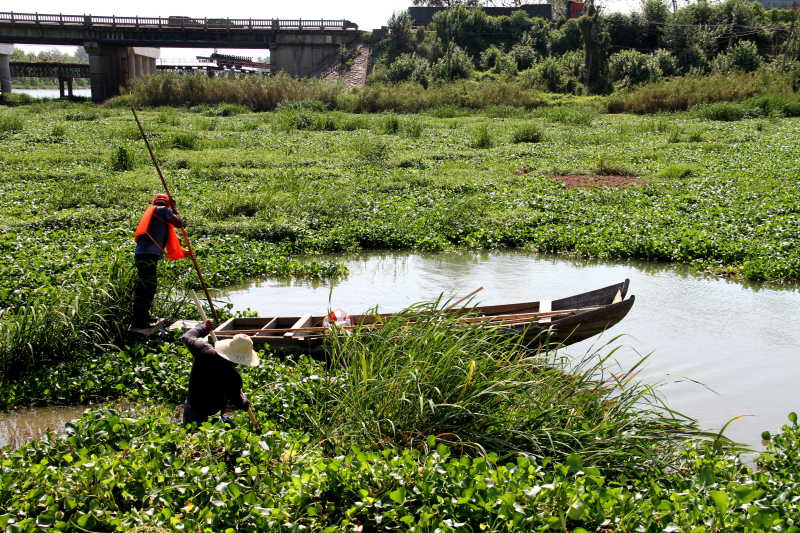 受下游橋梁施工截流及近期持續(xù)晴熱天氣影響,我市城區(qū)備用水源地淪河保護(hù)區(qū)內(nèi)水葫蘆大面積爆發(fā),將整個水面“霸占”得嚴(yán)嚴(yán)實(shí)實(shí),影響原水水質(zhì)安全。為清除隱患保障淪河應(yīng)急取水功能,在我公司高度關(guān)注和積極聯(lián)系下,淪河河長辦、孝南區(qū)朱湖辦事處等部門迅速組織清剿隊(duì),自8月21日起與水葫蘆展開“會戰(zhàn)”。