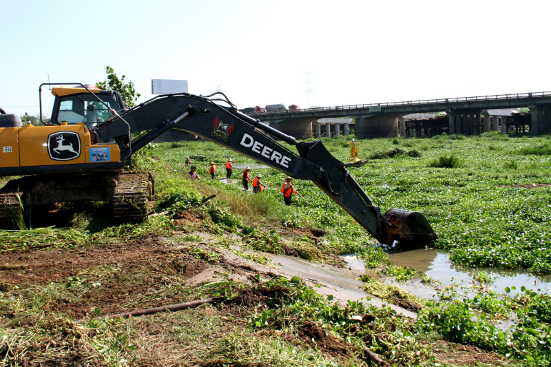 在淪河備用水源地保護(hù)區(qū),由河長辦和屬地政府組織的清剿隊(duì)已全面進(jìn)場,清除作業(yè)正在緊張進(jìn)行中。由于水葫蘆根系交錯,在水面上密織在一起,牽一發(fā)需動全身,常規(guī)的清除方式效率低下。為加快清除進(jìn)度,清剿隊(duì)采取機(jī)械與人工共同作業(yè)、分而治之的方式,即由工作人員先駕船將成片的水葫蘆根系分割打散,切塊后推往岸邊;到近岸處再用機(jī)械反鏟上岸,堆集碾壓暴曬后,裝運(yùn)到垃圾壓縮站,避免水葫蘆枯死腐敗對水源造成二次污染,確?!皵夭莩?,恢復(fù)河道生態(tài)平衡。